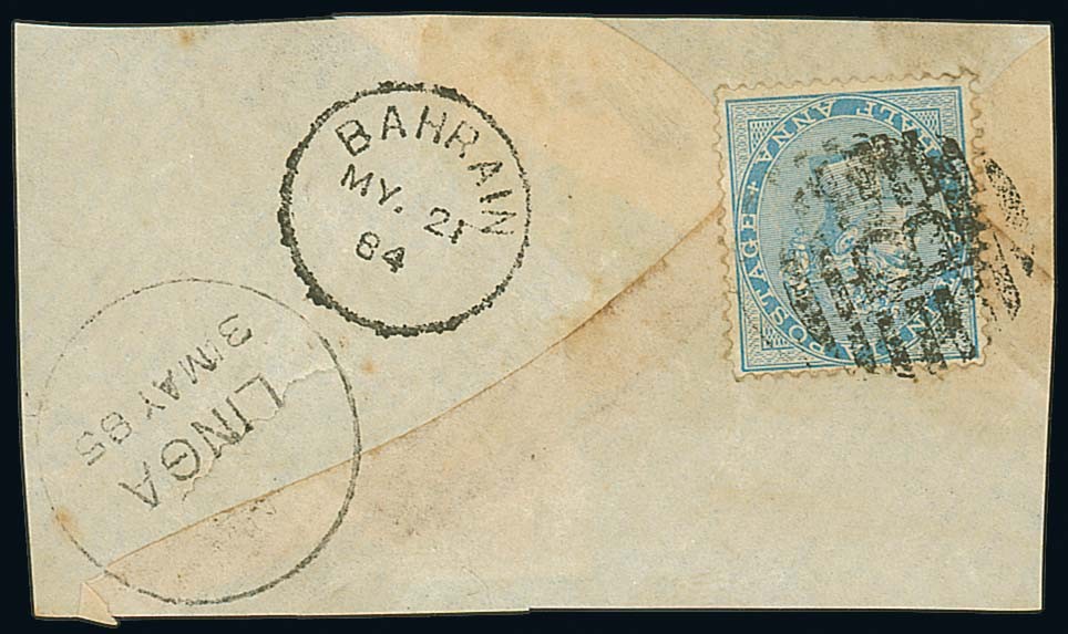 1885 (21 May) piece bearing ½a. cancelled "B" in circle of bars and showing Bahrain and Linga c.d.s. alongside, the first dated 1884 in error. A rare and very early item from this post office. Photo