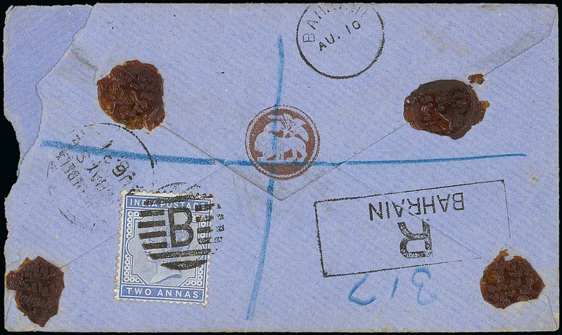 1886 (c.) (10 Aug.) 1a. brown on blue envelope registered to Bombay bearing, on reverse, 2a. blue cancelled by C12 "B" in circle of bars and additionally tied by arrival c.d.s. (31.8), "bahrain" c.d.s. (10.8) and framed "r/bahrain" registration handstamp, additional arrival c.d.s. on face; small portions at right missing through opening. Rare and regarded as the earliest recorded date of use of this cancellation and datestamp on cover. Photo