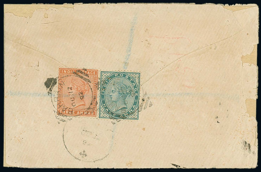 1892 (12 Oct.) envelope (opened-out) registered to Bombay bearing, on reverse, ½a. and 3a. both cancelled by C13 squared-circle datestamp and with indistinct arrival c.d.s. below, framed "r/bahrain" registration handstamp on reverse; edge faults though scarce. Photo