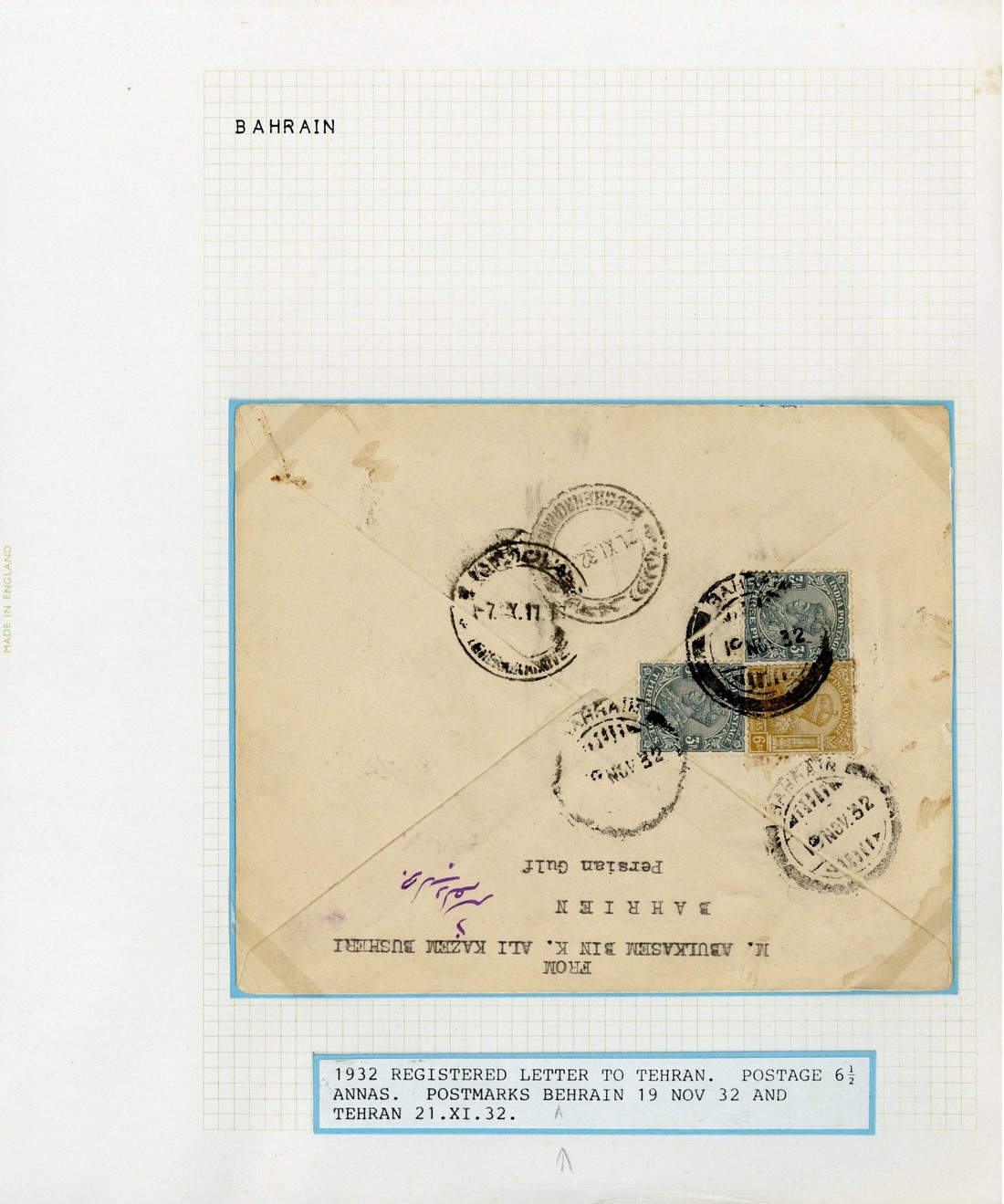 1931-33 envelopes (4) to Teheran, the first franked at "Book-Post" rate of ½a. cancelled by C33 c.d.s., the others at 3½a. (2) or 6½a. (registered) cancelled by C34 c.d.s., all with arrival c.d.s. alongside the adhesives