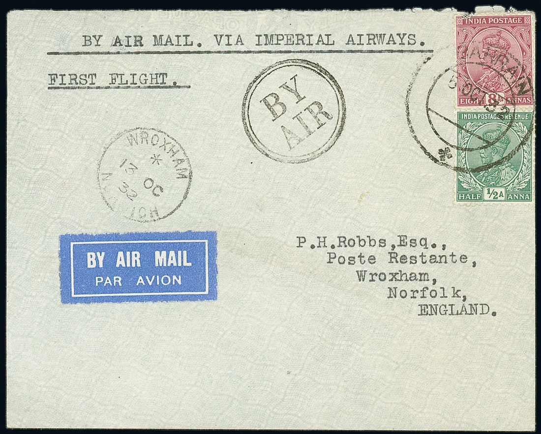 1932 (5 Oct.) Imperial Airways first flight to London on the return leg of the alternative route through the Trucial States, Kuwait, Bahrain and Sharjah, envelope to Norfolk bearing ½a. and 8a. sharing fine C33 c.d.s. and showing circular-framed "by/air" handstamp and arrival c.d.s. (13.10), all on face. Photo