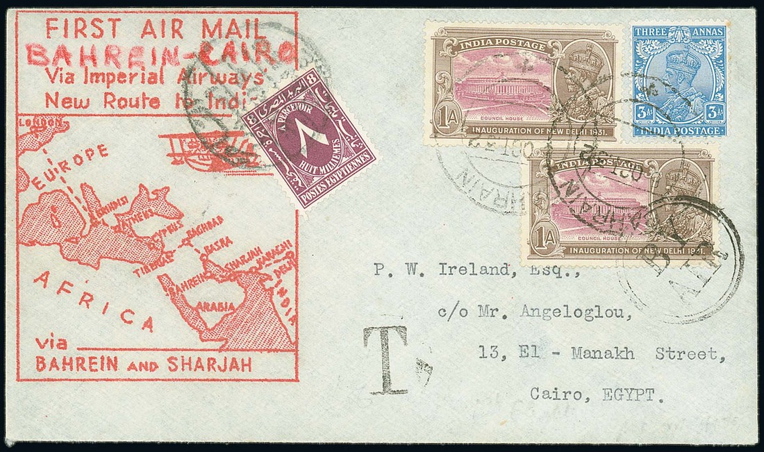 1932 (5 Oct.) Imperial Airways first flight to London on the return leg of the alternative route through the Trucial States, Kuwait, Bahrain and Sharjah, specially printed illustrated "route" envelope to Egypt underfranked at 5a. cancelled by C33 c.d.s., showing "T" handstamp and bearing Egypt 8m. purple Postage Due cancelled on arrival (8.10). Scarce. Photo