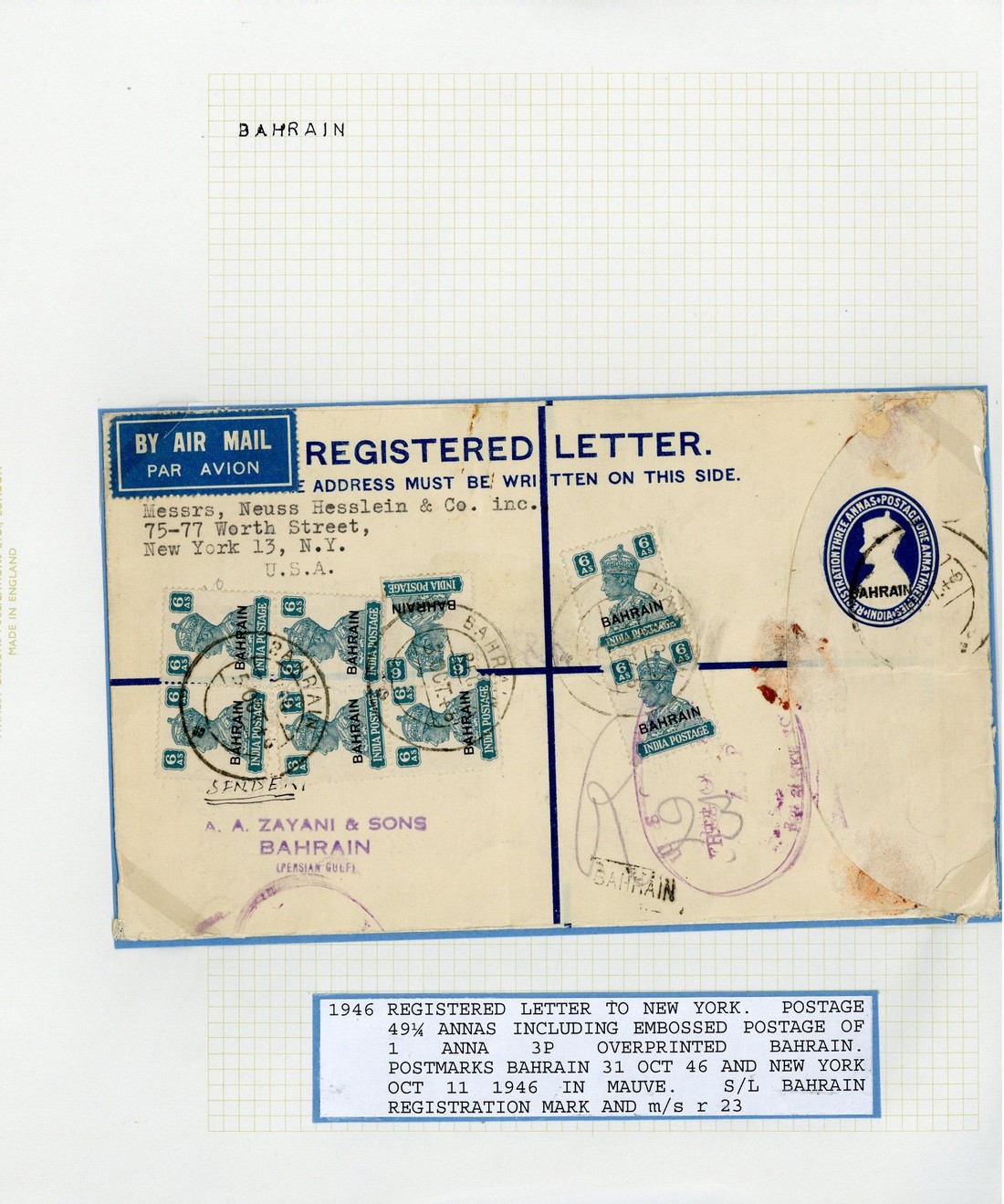 1943-47 envelopes (5) to U.S.A., comprising 1943 P.&T. type registered and redirected on arrival, despatch c.d.s. on reverse, 1945 via Lagos at 43½a., 1945 sent via Saudi Arabia and franked there with "Via Air Mail" notation altered to "Boat", 1946 4a.3p. registered envelope, uprated with 1942-43 6a. (8), and 1947 franked at 26½a.