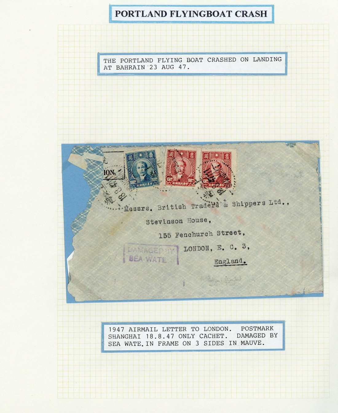 1947 (18 Aug.) envelope from China to England and recovered from the Portland flying boat which crashed on landing at Bahrain on 23 August, franked at $3,200 and showing boxed "damaged by/sea water" cachet at foot; part envelope missing at left through having been hastily opened. Unusual. Nierinck 470823