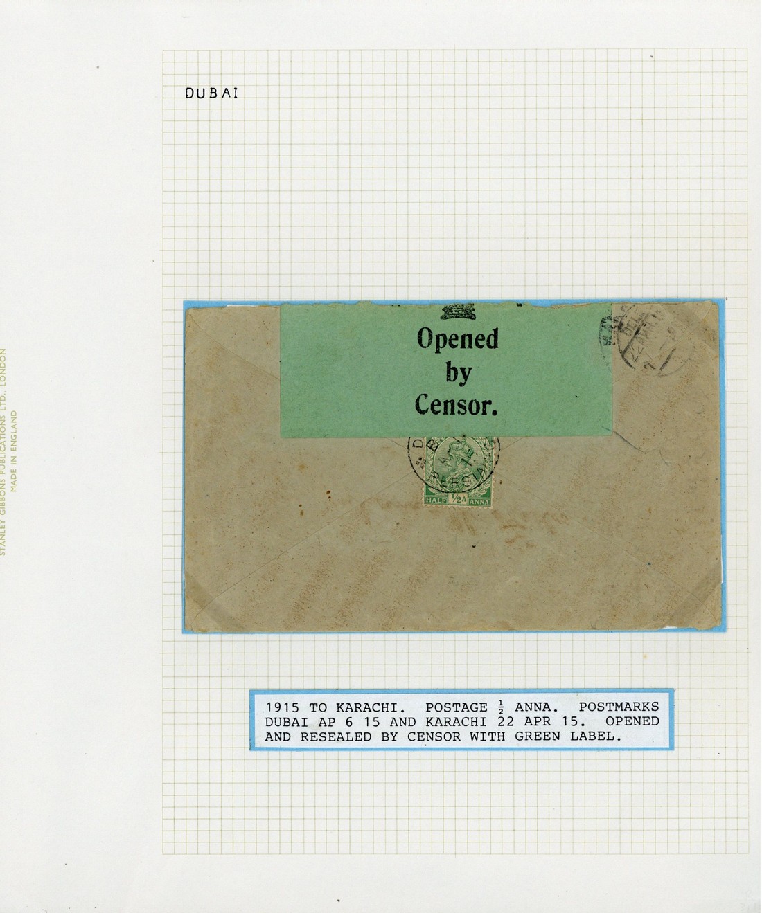 1913 and 1914 envelopes to Bombay and 1915 envelope to Karachi franked on reverse at ½a. or 1a., each with fine C37 "dubai/b.o./persian gulf" c.d.s., the last with green censor label, 1928 envelope to Bombay bearing ½a. (2) cancelled by "persian gulf section/bombay g.p.o." c.d.s.