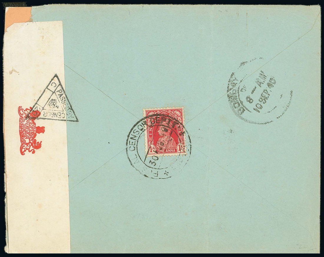 1940 (30 Aug.) envelope to Bombay with sender's cachet on face and bearing, on reverse, 1a. cancelled by the rare "postal censor deptt./karachi" c.d.s. with Bombay Delivery datestamp (10.9) alongside, censored with label and cachet. Photo