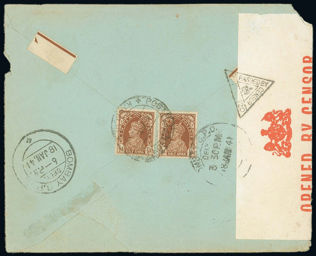 1941 (14 Jan.) envelope to Bombay with sender's cachet on face and bearing, on reverse, ½a. pair cancelled by the rare "postal censor deptt./karachi" c.d.s. with two different Bombay Delivery datestamps (18.1) alongside, censored with label and cachet. Photo