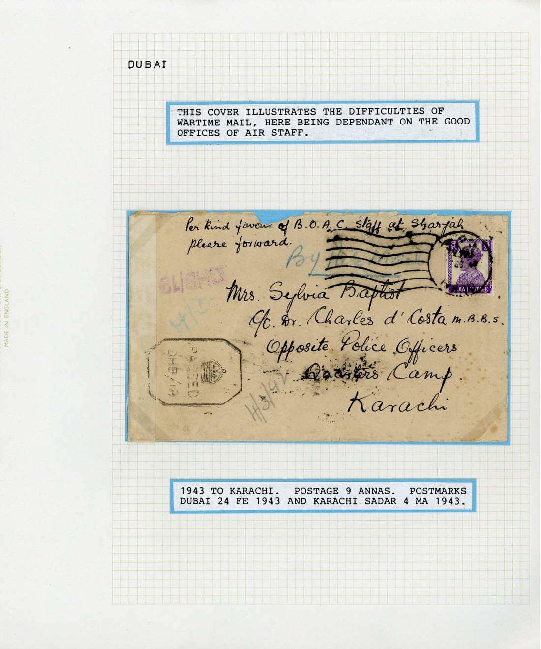 1943-47 envelopes to Bombay (9) and Karachi, variously franked and all cancelled by C38a "machine" type datestamp, one apparently correctly franked at 2½a. though considered underpaid and showing horseshoe-framed "dubai/due/ as." handstamp completed for 2a., six dated in 1943 censored