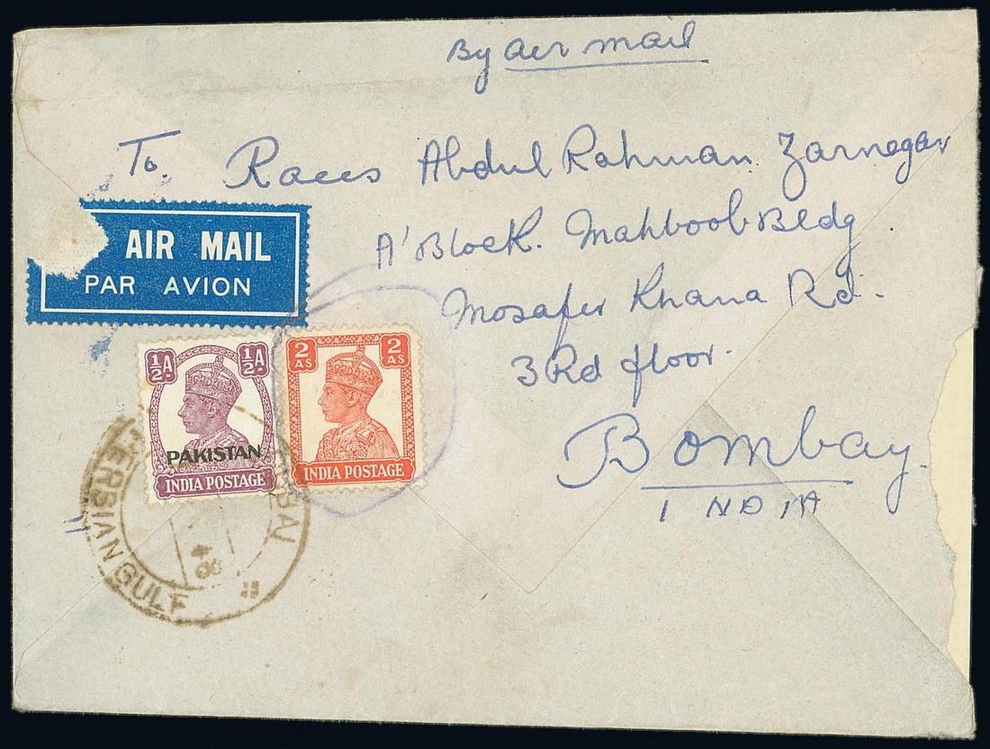 1948 (Jan.) envelope, addressed on front and reverse, to Bombay, the reverse side bearing ½a. in combination with unoverprinted 2a., ringed as unaccepted for postage, sharing single C38a c.d.s., the face panel showing horseshoe-framed "dubai/due/ as" handstamp and arrival c.d.s. (20.1) An unusual combination franking. Photo