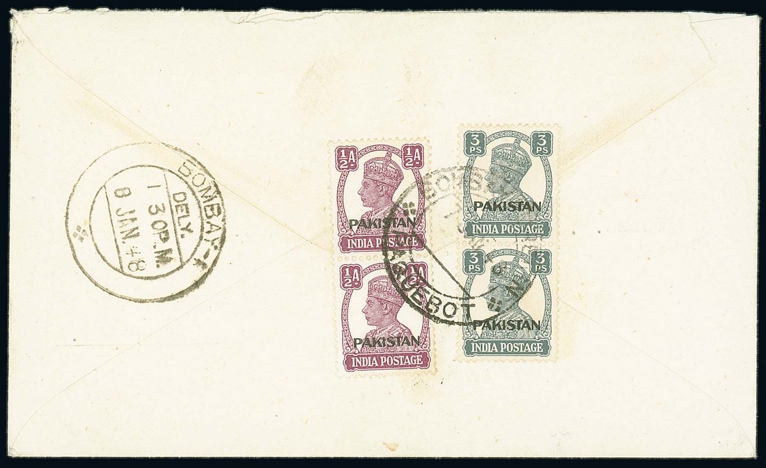 1948 (7 Jan.) envelope to Bombay giving sender's cachet as Sharjah and bearing, on reverse, 3p. and ½a. vertical pairs sharing Bombay Paquebot c.d.s. and with Delivery c.d.s. (8.1) alongside, clean and attractive; most unusual. Photo