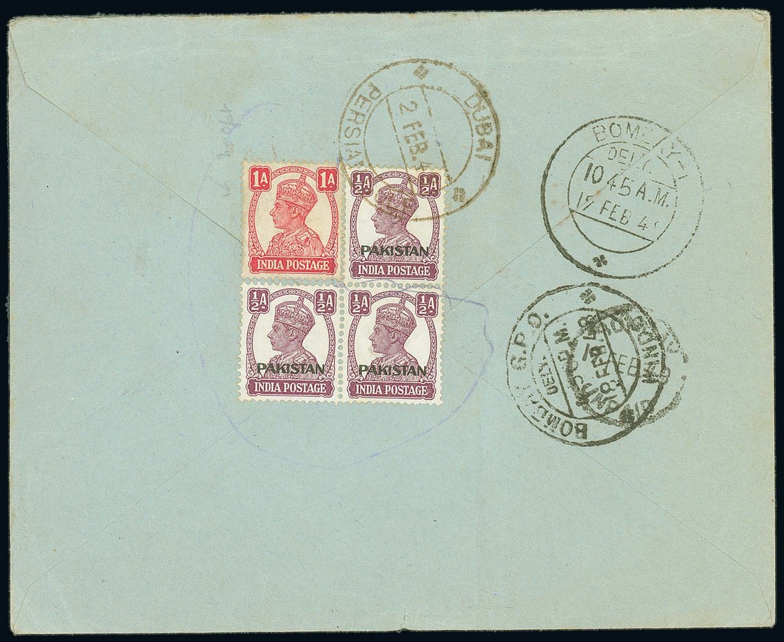 1948 (2 Feb.) envelope to Bombay bearing, on reverse, ½a. (3) and unoverprinted 1a., ringed as unaccepted for postage, cancelled by a fine single C38a c.d.s. and with Bombay Unpaid and Delivery datestamps (17.1 and 18.1) alongside, the face panel showing horseshoe-framed "dubai/due/ as" completed for 2as. Photo