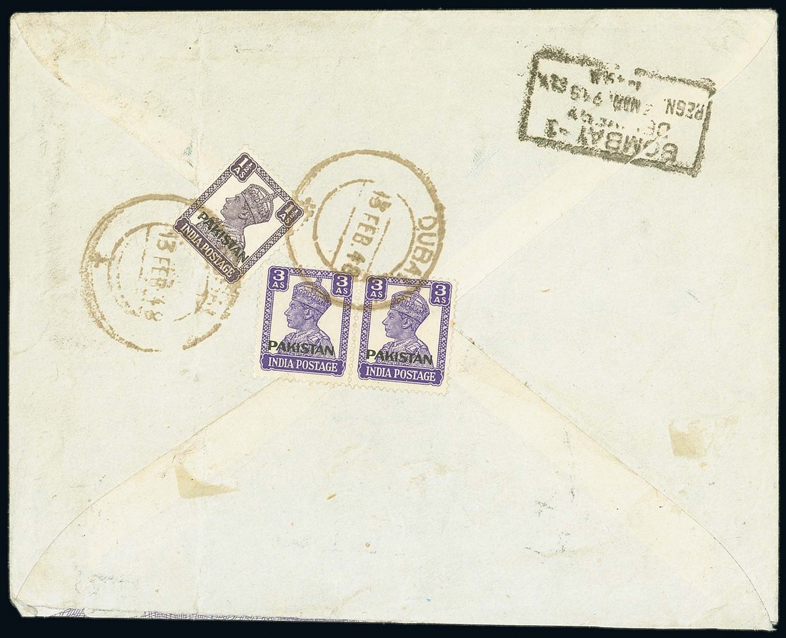 1948 (13 Feb.) envelope registered to Bombay bearing, on reverse, 1½a. and 3a. pair twice cancelled with fine C38a c.d.s. with boxed arrival datestamp (3.3) alongside, the face panel with boxed registration cachet. Photo