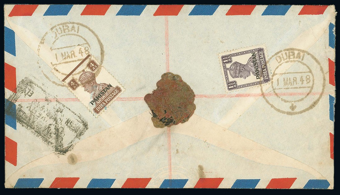 1948 (1 Mar.) envelope registered to Bombay bearing, on reverse, 1½a. and 4a. cancelled by fine C38a c.d.s. and with indistinct boxed arrival datestamp (10.3) alongside, boxed registration cachet on face. Photo