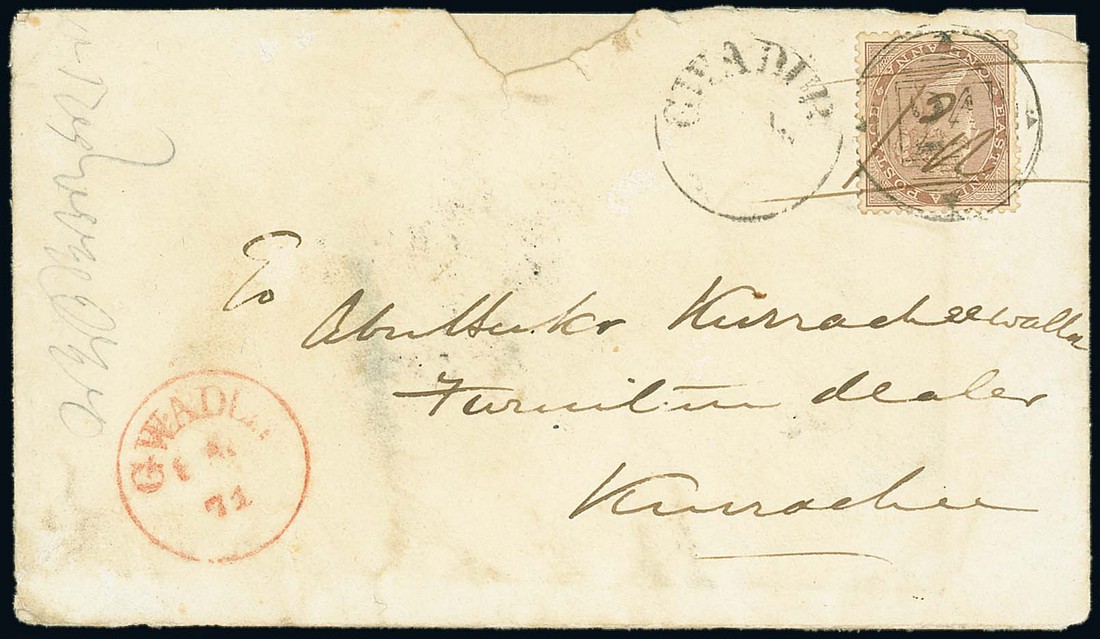 1871 (1 Aug.) envelope (small part at top and part of flap missing) to Karachi bearing 1a. brown with pen strokes and C5 "gwadur/24" duplex, Gwadur c.d.s. in red and arrival c.d.s. (9.8) on reverse. Photo