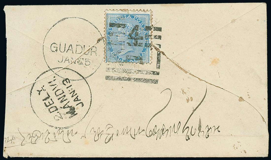 1876 (c.) (5 Jan.) envelope (fractionally truncated and small tear on opening) to Cutch Mandvi bearing, on reverse, ½a. blue cancelled by fine "guadur/4/k-1" duplex with arrival c.d.s. (13.1) alongside. Scarce so fine. Photo