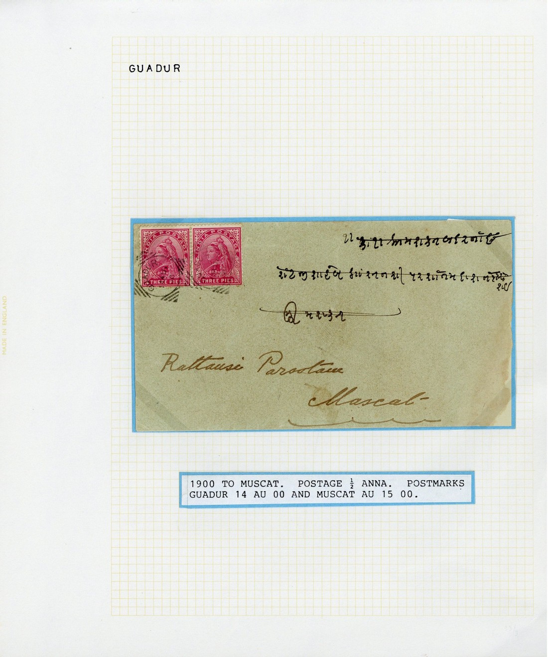 1895 (Apr.) large piece to Zanzibar bearing 2½a., 1897 1a. brown envelope to Bombay and 1900 envelope to Muscat bearing 3p. pair, all cancelled by C32 squared-circle datestamps; fair to fine strikes