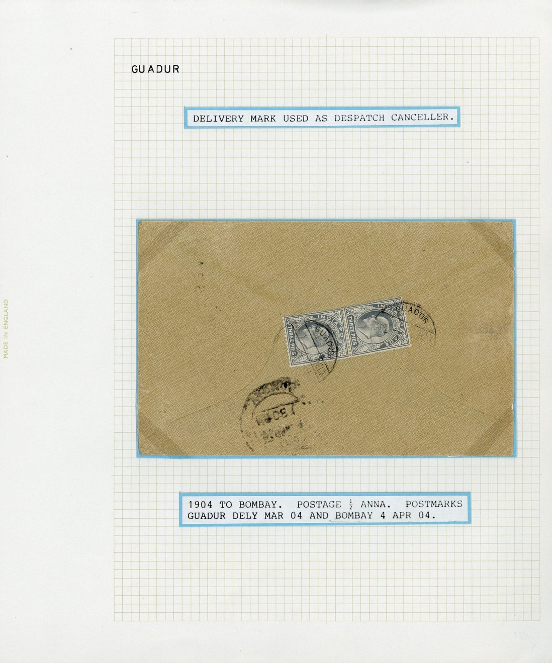 1904-13 envelopes (3, one partially cut down) or cards (3) franked at 3p. or ½a. and cancelled by squared-circle datestamp (3), straight-line datestamp or Delivery c.d.s. (2); 1922 and 1928 envelopes to Muscat, the first registered, both cancelled by double-ring datestamp, and 1925-33 envelopes (6, a couple large part only) and an envelope back, all to Karachi at various rates and cancelled by "bridge" type c.d.s.; faults in places