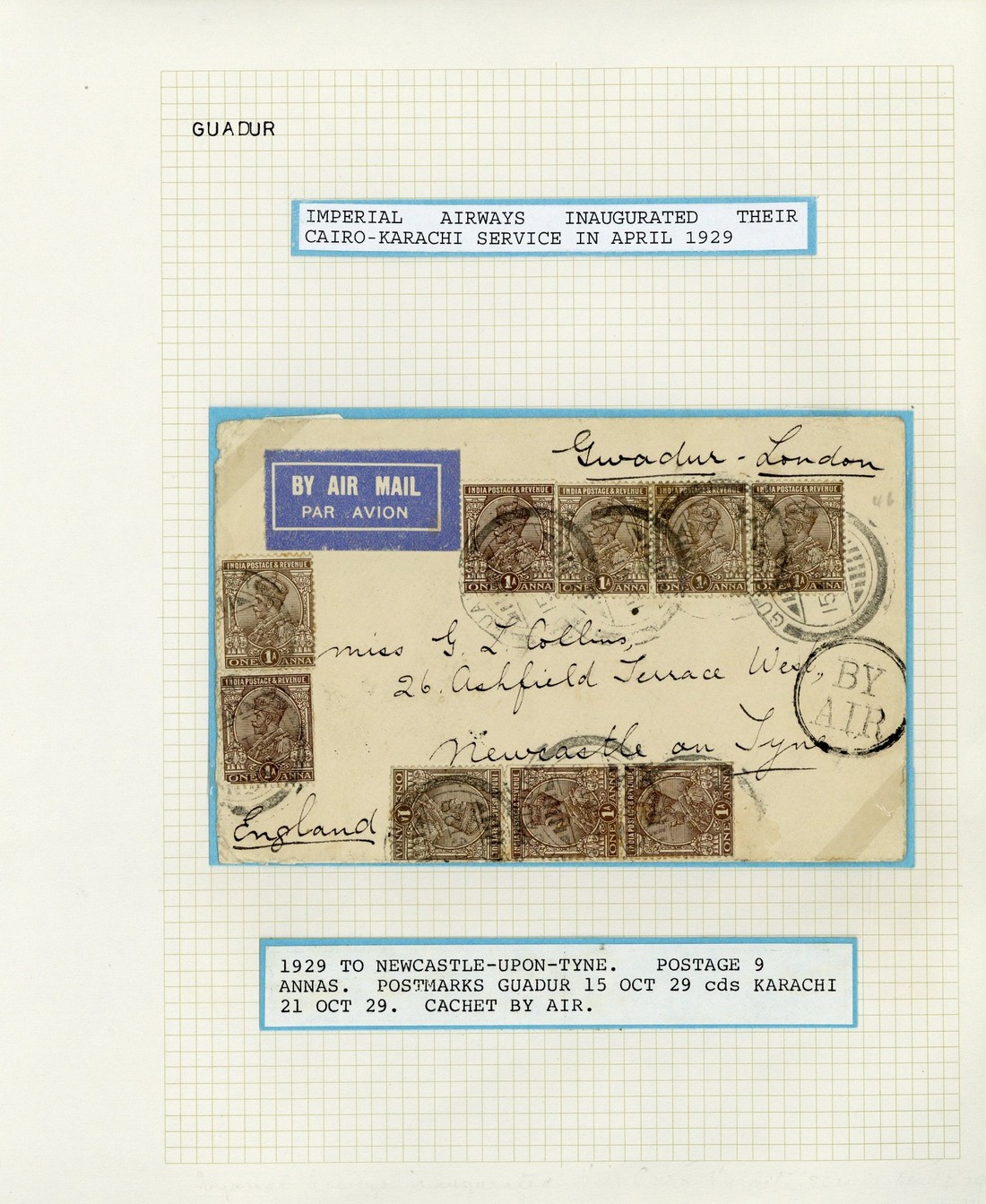 1929 (15 Oct.) Imperial Airways Cairo-Karachi service envelope (complete with original Memo slip) to England, bearing 1a. brown (9) with "bridge" type c.d.s. and showing circular-framed "by/air" handstamp, the reverse with Bombay (19.10) and Karachi (21.10) c.d.s., and G.B. ½d. cancelled at Newcastle on arrival (6.11)