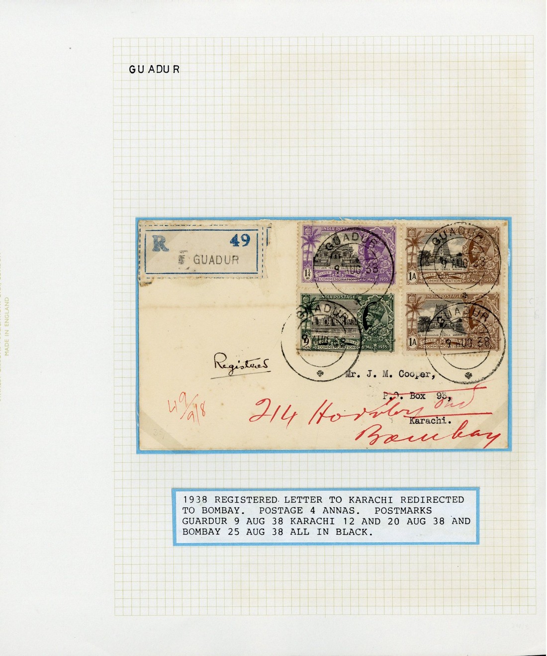 1938-40 envelopes to Karachi (5), comprising 1938 (Aug.) registered and redirected to Bombay bearing 1935 Jubilee values (4) sharing C33a c.d.s., 1939 franked at 1½a. with C33 c.d.s., 1939 (2, both registered) franked at 5½a. and 7½a., both with C33a c.d.s., and 1940 bearing 1a. with C33 c.d.s.; good to fine strikes