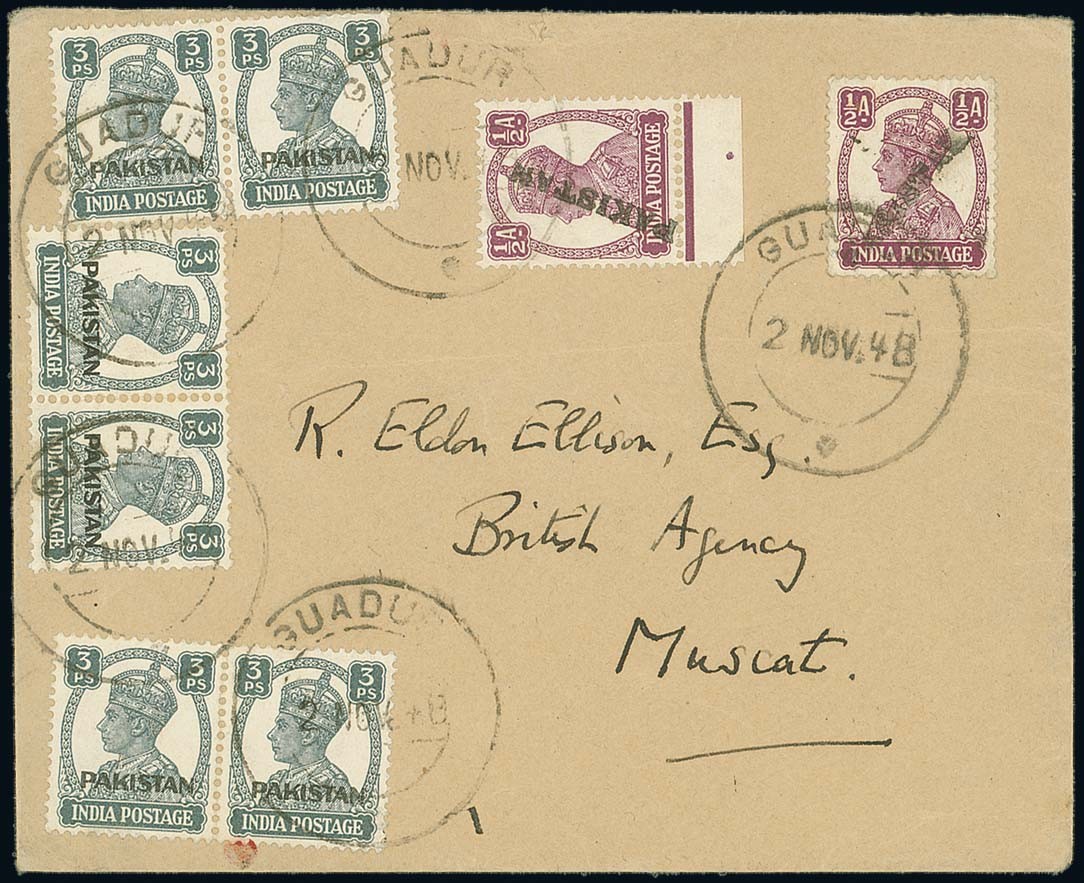 1948 (2 Nov.) envelope to Muscat bearing India ½a. purple (2) with "pakistan" handstamped overprint and 1947 3p. grey (6) all neatly cancelled by double-ring datestamp, the reverse with a further Guadur datestamp (4.11) and arrival c.d.s. (2.12). A very rare franking. B.P.A. Certificate (1972). Photo