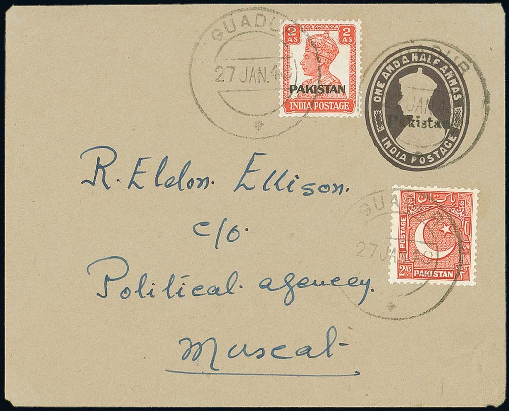 1949 (27 Jan.) 1½a. brown-purple envelope overprinted "Pakistan" by machine printing at Quetta, uprated with 1947 2a. red and 1949 2a. red, each neatly cancelled by double-ring datestamp. Very rare, being the first example recorded of Quetta overprinted stationery used at Guadur. Photo