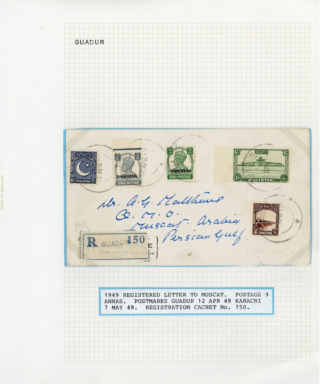 1949 (Apr.) envelopes (5, four registered) ex the same correspondence to Muscat, bearing a variety of values and franked at 3½a., 4a., 8a., 9a., 16½a. and 1r.10a. with a combination of 1947 and 1949 adhesives, all cancelled by double-ring datestamps. A fine and attractive group