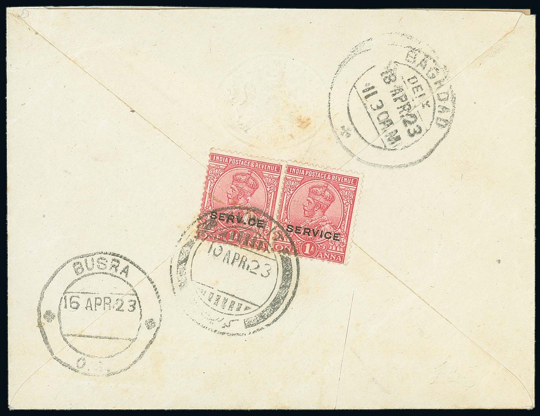 1923 (10 Apr.) OHMS envelope to "Air Headquarters", Baghdad bearing, on reverse, Official 1a. carmine (2, one with a surface fault) sharing fine C34b "kuwait" c.d.s. with Basra (16.4) and Baghdad Delivery (18.4) c.d.s. alongside; envelope with cut at foot clear of the adhesives. A very usage of Official adhesives. B.P.A. Certificate (1981). Photo