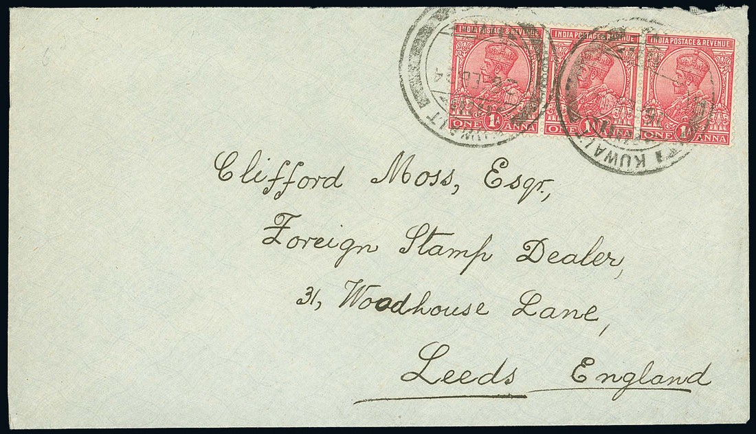 1924 (26 Feb.) Moss envelope to England bearing 1a. carmine strip of three twice neatly cancelled by C34b "kuwait" c.d.s.; very fine. Photo