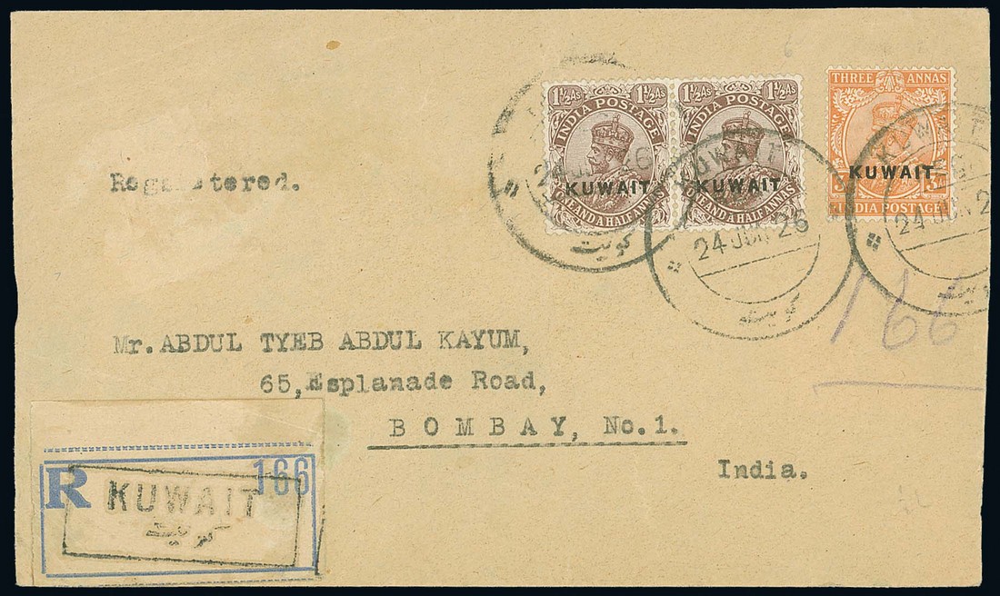 1926 (24 July) envelope registered to Bombay, bearing 1½a. chocolate Type B pair inscribed "annas" and 3a. dull orange all cancelled by C38a c.d.s. and with handstamped registration label at lower left corner, arrival c.d.s. (10.7) on reverse; envelope with a couple of small surface abrasions. The 1½a. Type B very rare on cover. R.P.S. Certificate (1996). Photo