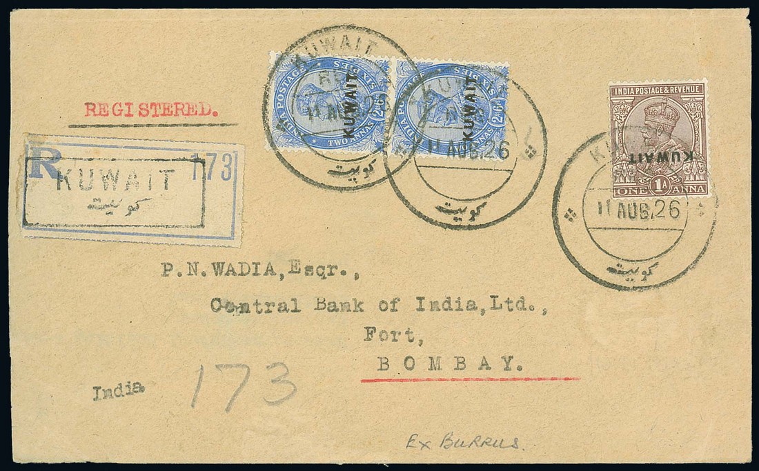 1926 (11 Aug.) envelope registered to Bombay, bearing 1a. with inverted overprint and 2½a. pair neatly cancelled by C38a c.d.s. and with handstamped registration label alongside, arrival c.d.s. (31.8) on reverse. Photo