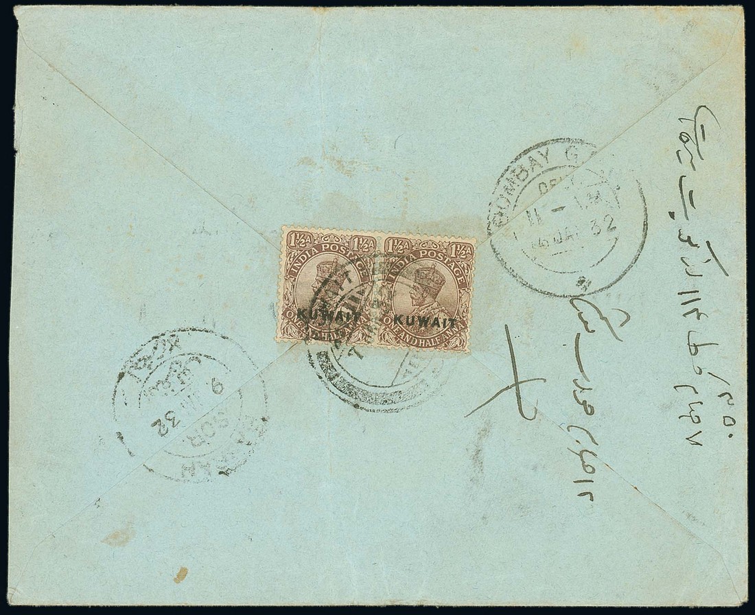 1932 (7 Jan.) envelope to Bombay bearing, on reverse, 1½a. chocolate Type A pair sharing C34b c.d.s. and with Basra (9.1) and Bombay (16.1) c.d.s. alongside; vertical crease crossing the left-hand stamp and with some light gum staining around the pair though a scarce non-philatelic franking. Photo