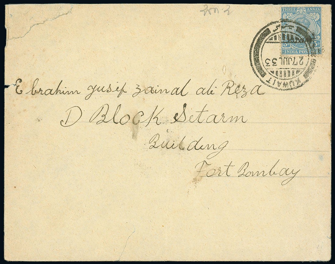 1933 (27 July) envelope to Bombay, bearing 3a. ultramarine with neat C34b c.d.s., the reverse with Basra (28.7) and Bombay (5.8) c.d.s.; a scarce stamp used alone, especially on non-philatelic mail. Photo