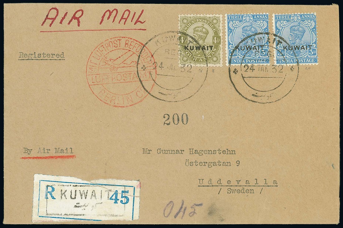 1932 (24 Jan.) envelope registered to Sweden bearing, on reverse, ½a. pair, 1a., 1½a., 2a. and 2½a. and, on face, 3a. ultramarine (2) and 4a. all neatly cancelled by C38a c.d.s., handstamped registration label at foot and with "mit luftpost befordert/luftpostamt/berlin c2" illustrated cachet in red; most attractive. Photo