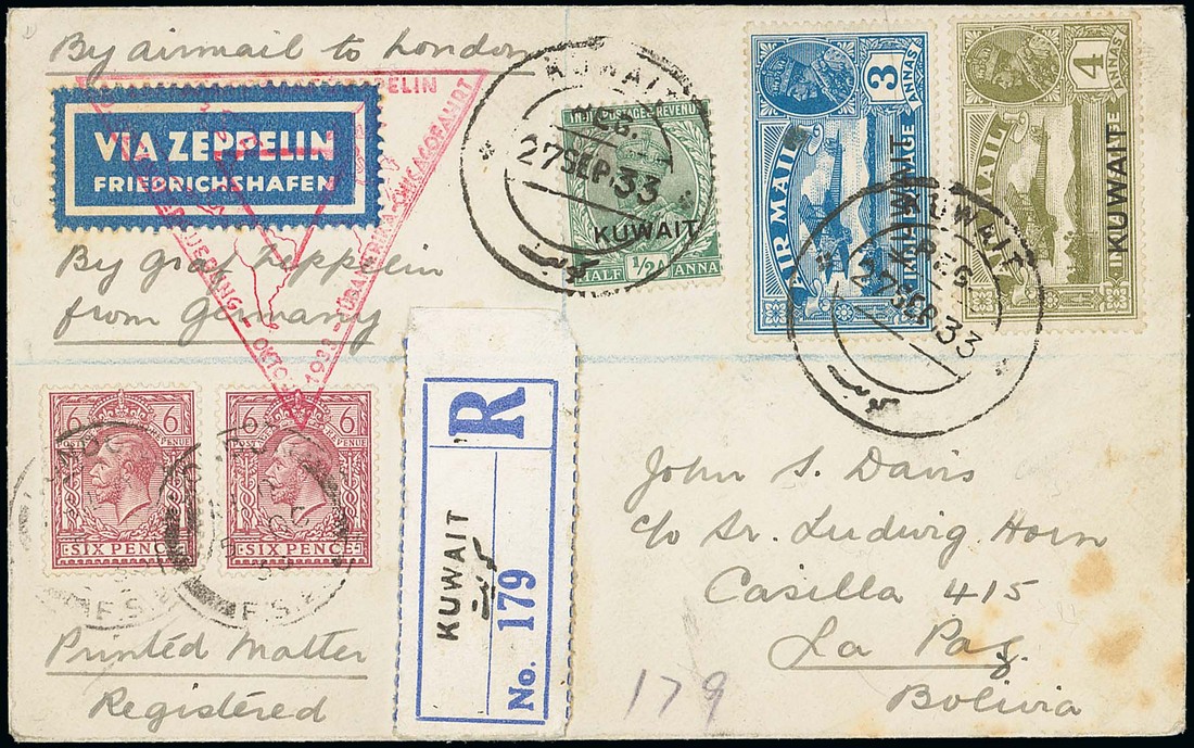 1933 (27 Sept.) 11th. South America Zeppelin flight envelope registered to La Paz, Bolivia, bearing ½a. and 1933 Air 3a. and 4a. with C38a c.d.s. and G.B. 6d. (2) tied by London c.d.s. (5.10), handstamped registration label and showing triangular-framed flight cachet in red on face, the reverse with despatch c.d.s., hexagonal-framed flight cachet in red and two arrival datestamps (25.10) in violet. A rare acceptance. Photo