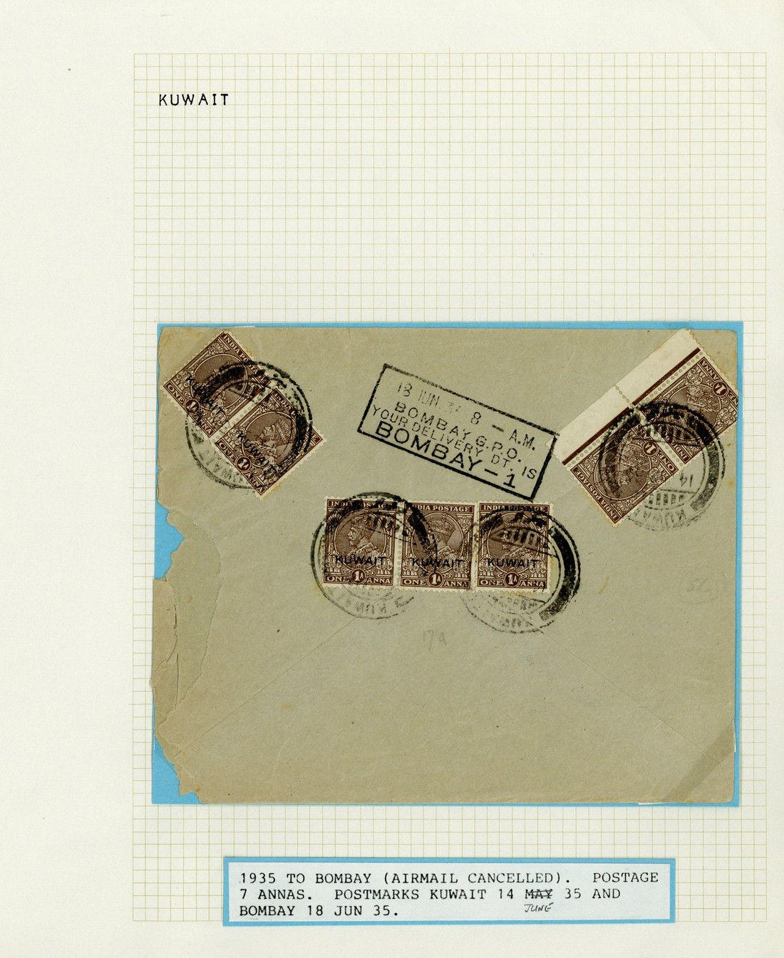 1935 (14 June) envelope to Bombay bearing, on reverse, 1a. brown (5) in combination with unoverprinted 1a. brown pair (a little affixed over edge), all cancelled by C34b c.d.s. and with boxed arrival datestamps (18.6) alongside, the face panel with Air Mail cachet handstamped by Bombay "cancelled" cachet; the envelope roughly opened and with faint foxing on some adhesives though an unusual item