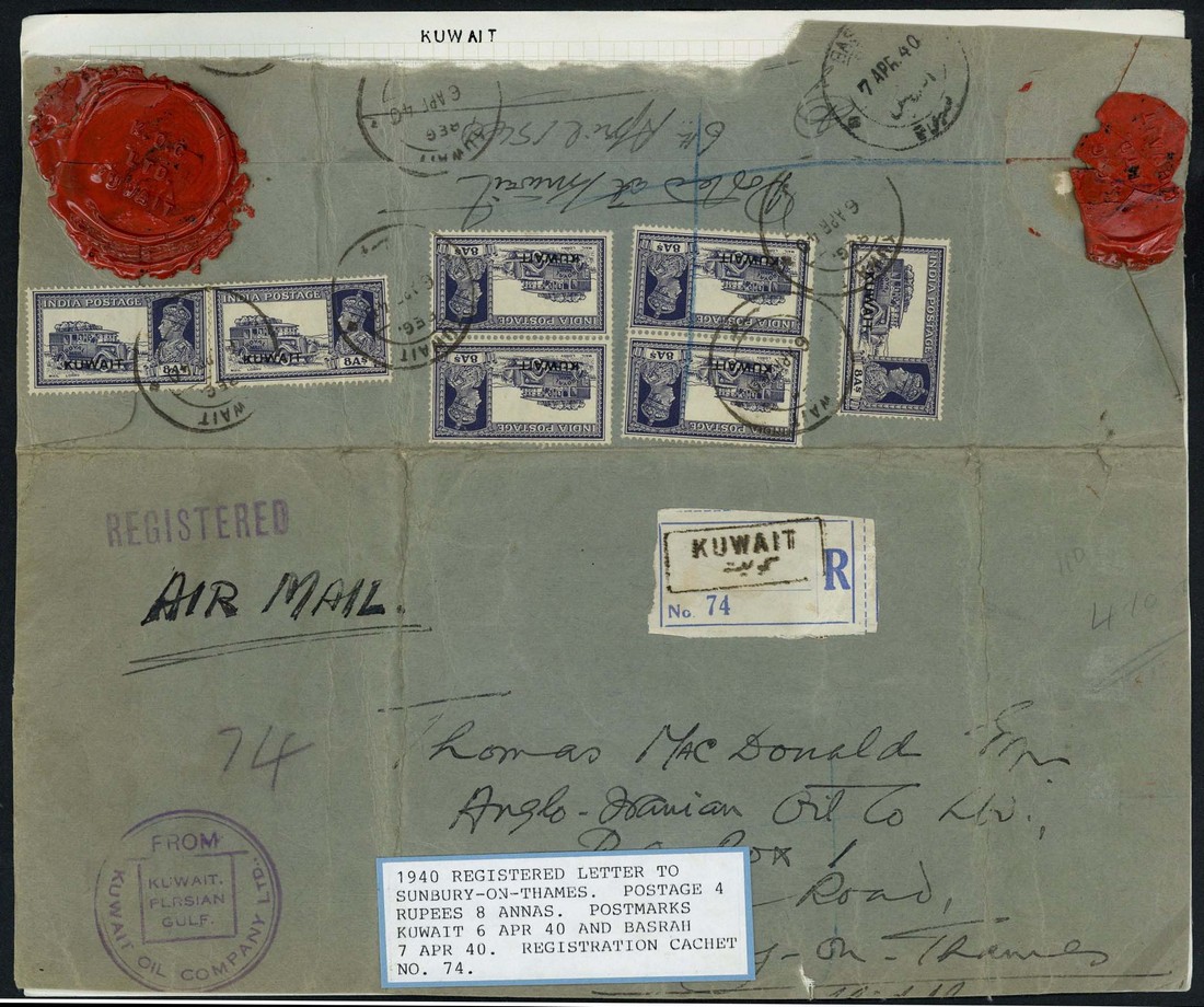 1940 (6 Apr.) large linen-back envelope (partially truncated) registered from the Kuwait Oil Co. Ltd. to England bearing, on reverse, 1939 8a. pairs (3) and a single cancelled by C38a c.d.s. and with two large red wax seals of the sender, the face panel with sender's cachet and handstamped registration label; an unusually large commercial franking