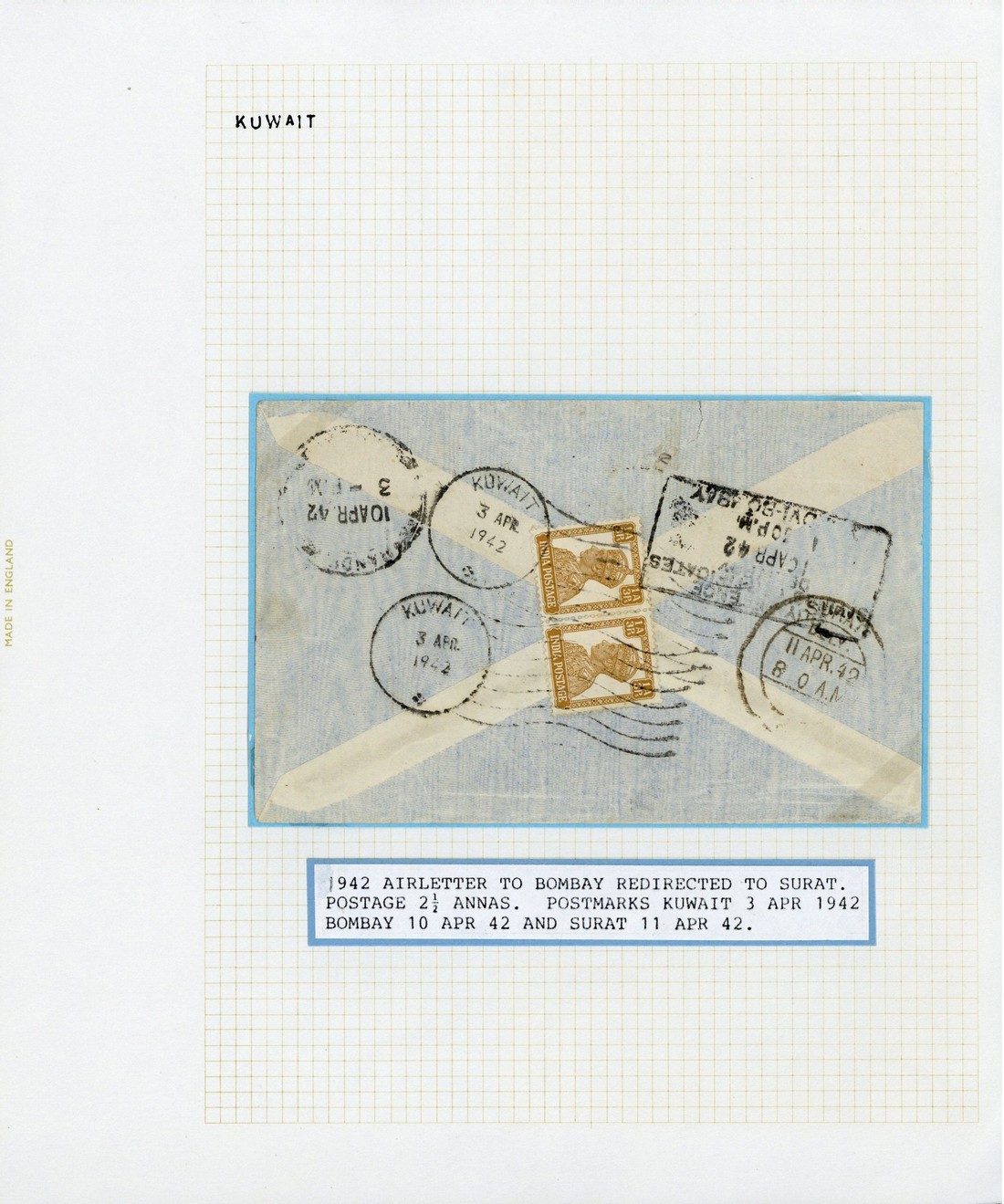 1942-46 envelopes (4) to Bombay, comprising 1942 bearing India 1a.3p. pair with C36a machine style datestamp, 1942 franked at 4a. with C38 datestamps, 1945 registered at 5½a. with C33a and 1946 with India ½a. and Kuwait 2a. sharing C36a; also 1946 surface mail cover (faults) franked at 2a.3p. with C36a