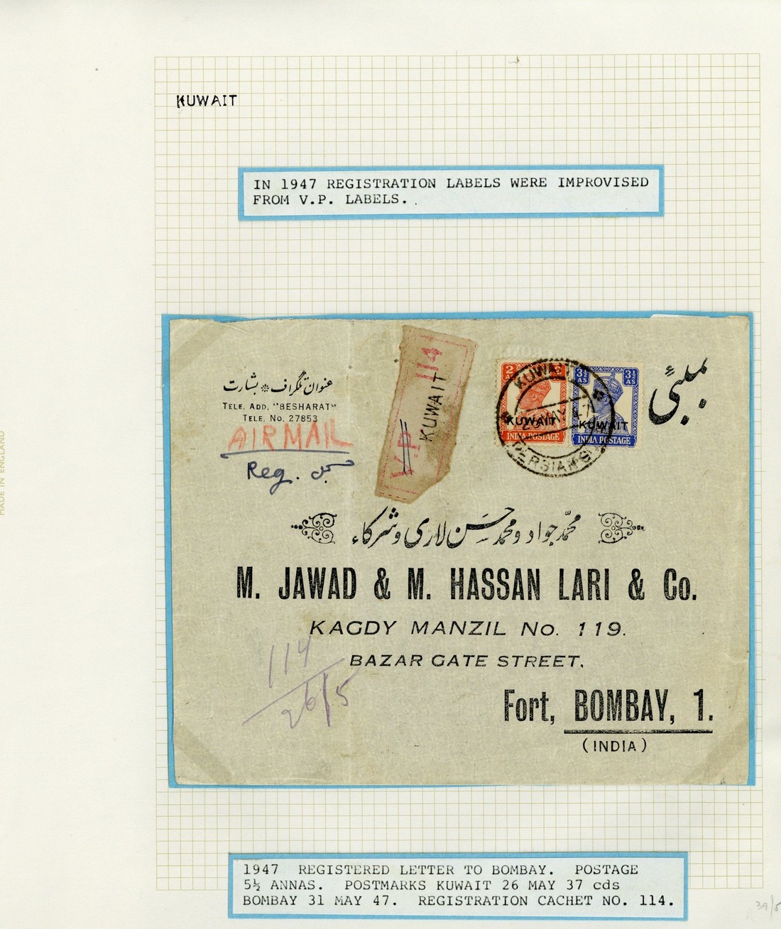 1947 (26 May) envelope registered to Bombay, bearing 2a. and 3½a. sharing C38 c.d.s. and with improvised registration label from red on cream VP label, arrival datestamp (31.5) on reverse