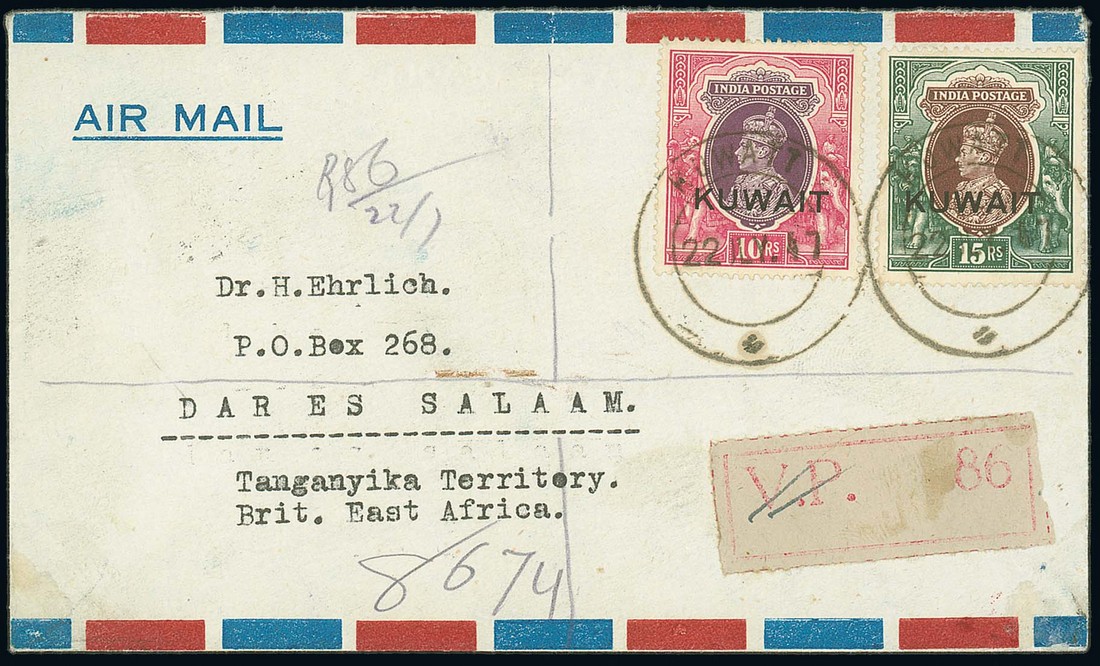 1947 (22 July) envelope registered to Tanganyika, bearing 1939 10r. and 15r. both cancelled by C33 c.d.s. and with improvised registration label from red on cream VP label, Cairo, Mombasa (1.8) and Dar Es Salaam (2.8) datestamps on reverse. A rare franking. Photo