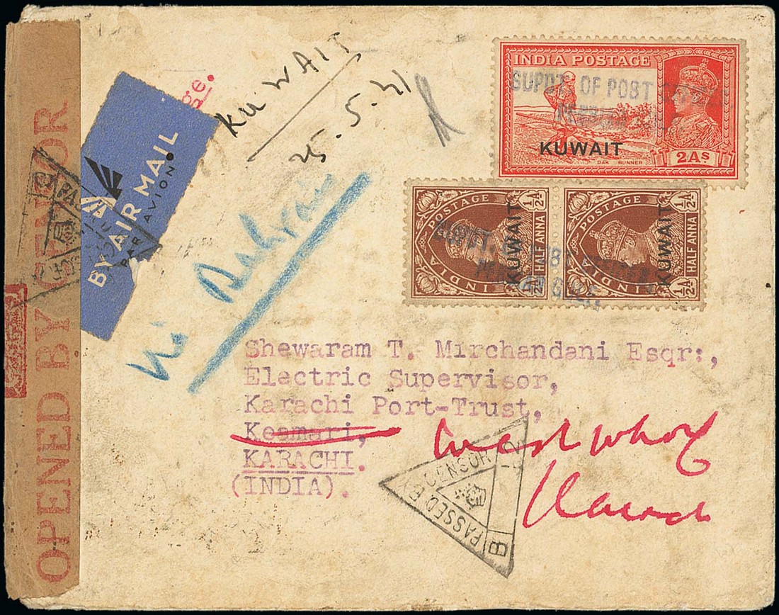 1941 (25 May) envelope to Karachi and redirected locally, bearing 1939 ½a. pair and 2a. both cancelled by "supdt. of post offices,/persian gulf." rubber handstamp in blue, showing censor cachet, red on buff label at left and, on reverse, four different transit/arrival datestamps; a little soiled though very rare with only a handful of covers recorded during the three week period this provisional handstamp was in use. Photo