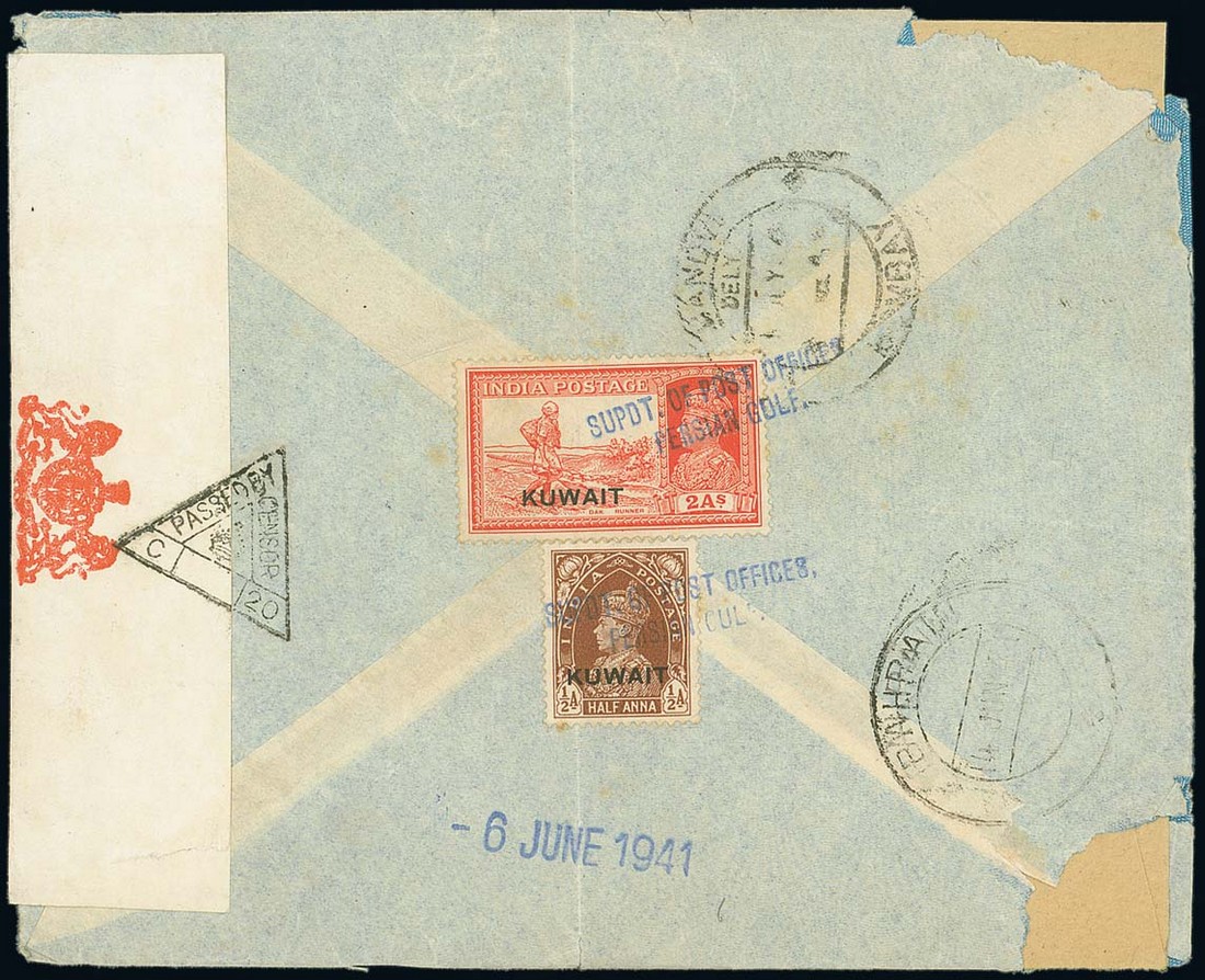 1941 (6 June) envelope (two corner faults) to Bombay bearing, on reverse 1939 ½a. and 2a. both cancelled by "supdt. of post offices,/persian gulf." rubber handstamp in blue with "-6 june 1941" straight-line datestamp in the same ink below, red on white censor label tied by triangular-framed cachet. Very rare. Photo