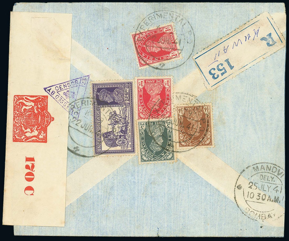 1941 (22 June) envelope registered to Bombay bearing, on reverse, 3p., ½a., 1a. (2) and 2½a. cancelled by three "experimental p.o./k-79" c.d.s., blank registration label completed in manuscript, red on white censor label and cachet in violet, and arrival c.d.s. (25.7). Photo