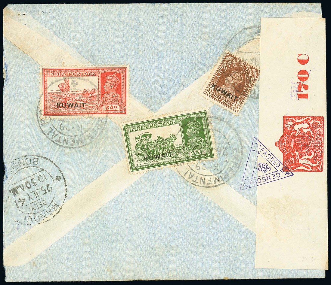 1941 (26 June) envelope registered to Bombay bearing, on reverse, ½a., 2a. and 3a. each cancelled by "experimental p.o./k-79" c.d.s., Experimental P.O. handstamped registration label on face, red on white censor label and censor cachet in violet, arrival c.d.s. (25.7) on reverse. Photo