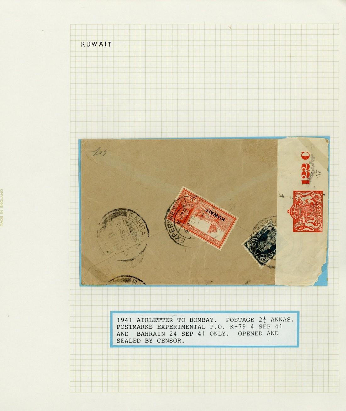 1941 (4 Sept.) envelope to Bombay bearing, on reverse, 3p. and 2a. both cancelled by "experimental p.o./k-79" c.d.s., red on white censor label, and arrival c.d.s. (24.9)