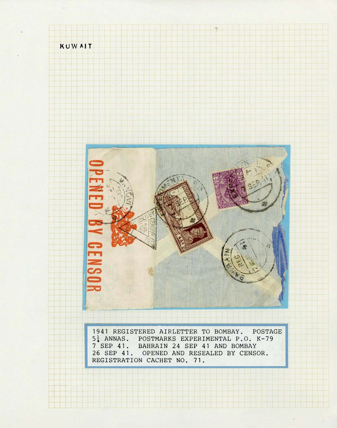 1941 (7 Sept.) envelope (opened-out, roughly opened) registered to Bombay bearing, on reverse, 1a.3p. and 4a. both cancelled by "experimental p.o./k-79" c.d.s., Experimental P.O. handstamped registration label on face, red on white censor label and censor cachet