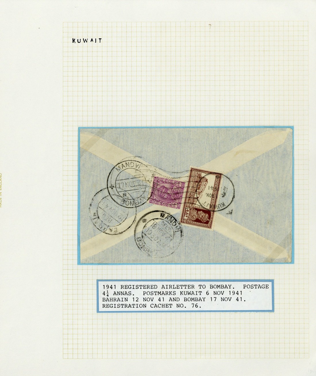 1941 (12 Nov.) envelope registered to Bombay bearing, on reverse, 1a.3p. and 4a. sharing C36a datestamp and with transit/arrival (18.11) c.d.s. alongside, handstamped registration label and censor cachet on face