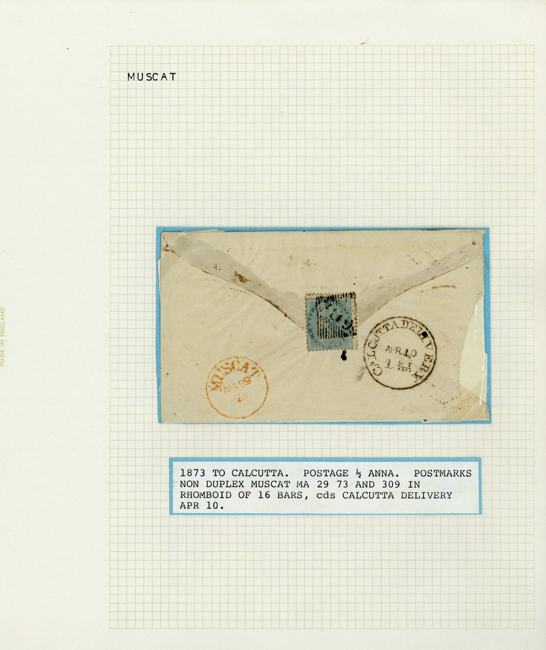 1873 (29 Mar.) envelope (small part torn away on opening) to Calcutta bearing, on reverse, ½a. blue with a fair strike of the numeral and showing despatch c.d.s. in red and arrival Delivery c.d.s. (10.4) either side of the adhesive, Bombay transit datestamp (7.4) on face