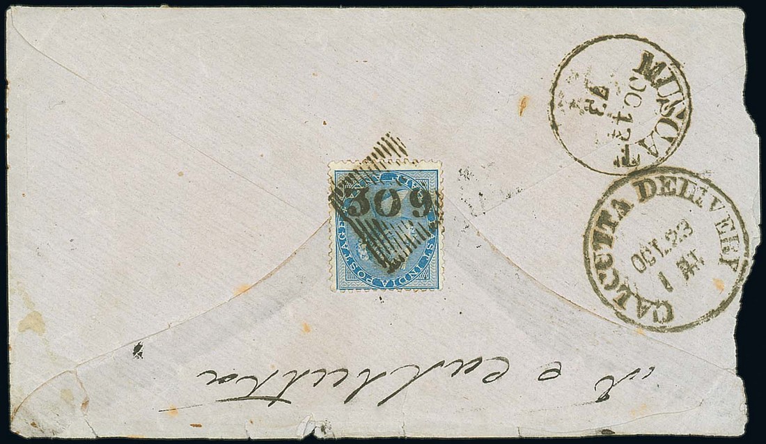 1873 (12 Oct.) envelope to Calcutta bearing, on reverse, ½a. blue with a fine strike of the numeral and showing despatch and Delivery arrival (23.10) c.d.s. alongside, Bombay transit datestamp (20.10) on face. Photo