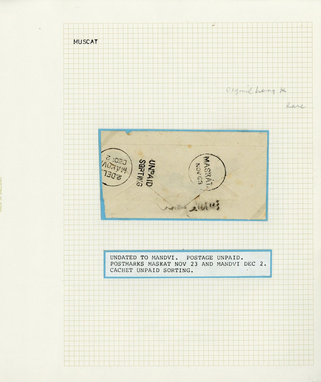 Undated unpaid envelope to Cutch Mandvi showing, on reverse, "muskát" c.d.s. (23.11) with long "k", unframed "unpaid/sorting" handstamp and arrival c.d.s. (2.12)