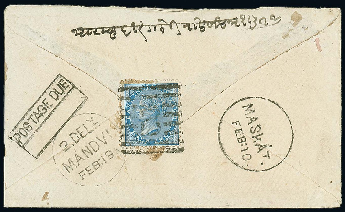 Undated envelope to Cutch Mandvi bearing, on reverse, ½a. blue with a fine strike of the "B", "muskát" c.d.s. (10.2) with long "k", framed "postage due" handstamp uncompleted and arrival c.d.s. (19.2). Photo